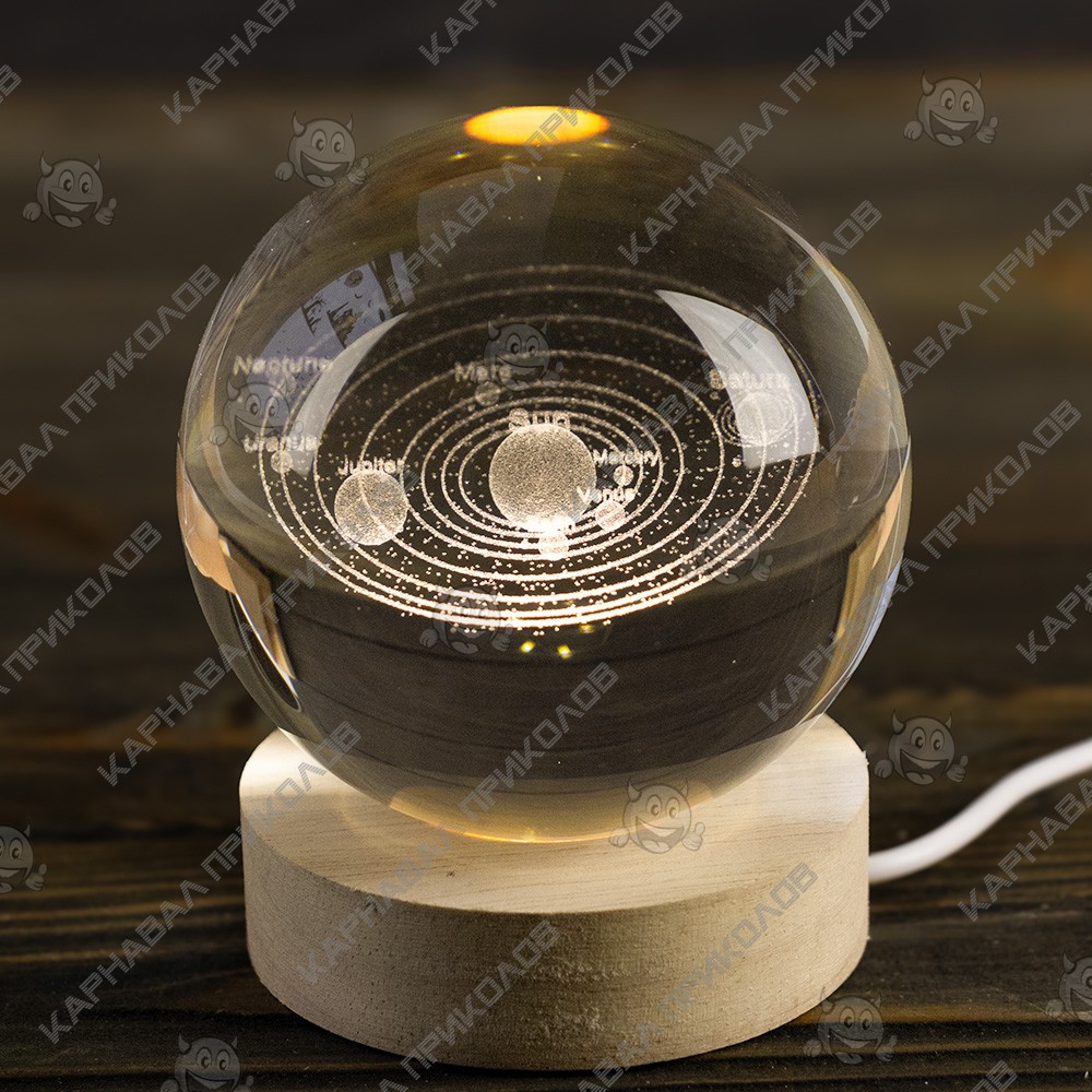 Комплектація: Кришталева куля, дерев'яна LED-підставка, кабель USB. Живлення: Універсальний USB-кабель. Можна підключити до ноутбука, PowerBank або мережного адаптера. Тип свічення: Теплий білий. |