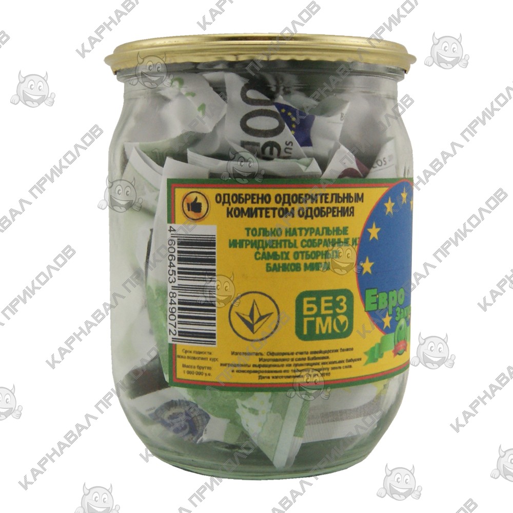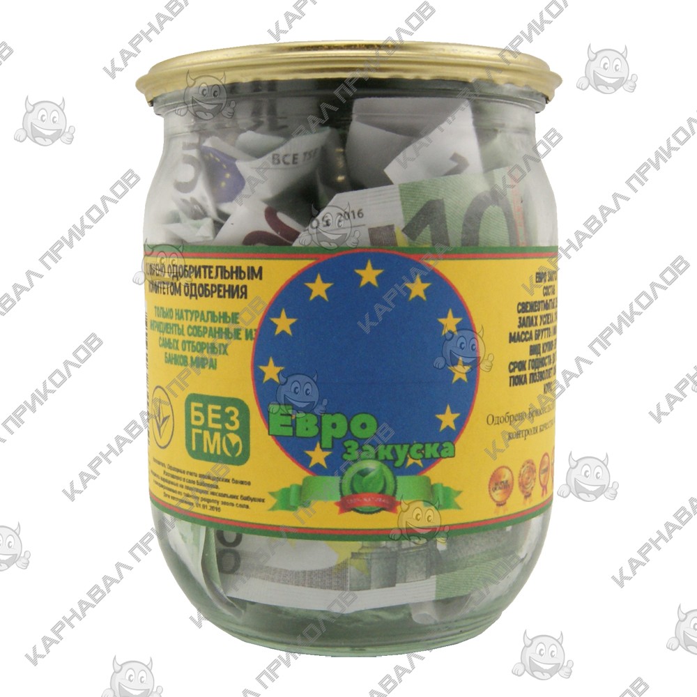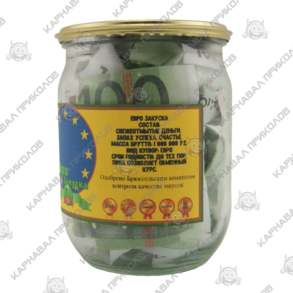 Мрієте про європейський рівень життя? Тоді Грошовий подарунок Євро закуска від Карнавал Приколів – ваш ідеальний вибір! Ця стильна консервація містить сувенірні купюри євро, акуратно згорнуті та заготовлені для фінансових перекусів. Етикетка оформлена в європейському стилі, із символом євро та зоряним колом, натякаючи на європейську якість та достаток. Прекрасний подарунок для мандрівників, мрійників та всіх, хто прагне фінансової стабільності у світовому масштабі. Шукаєте по-справжньому незвичайний подарунок, що запам'ятовується, який викличе посмішку і підніме настрій? Вам допоможе Законсервоване Багатство. Грошовий подарунок Євро закуска – це дотепний та креативний спосіб вручити гроші чи просто побажати фінансового благополуччя. Подарунок є скляною банкою, герметично закатаною металевою кришкою, як справжня консервація на чорний день, і наповнена сувенірними купюрами, що відповідають тематиці. Оригінальна етикетка із гумористичним дизайном завершує образ, роблячи цей сувенір ідеальним для будь-якого свята! Відмінний вибір для днів народжень, весіль, корпоративних вечірок чи просто як жартівливий презент із глибоким змістом.